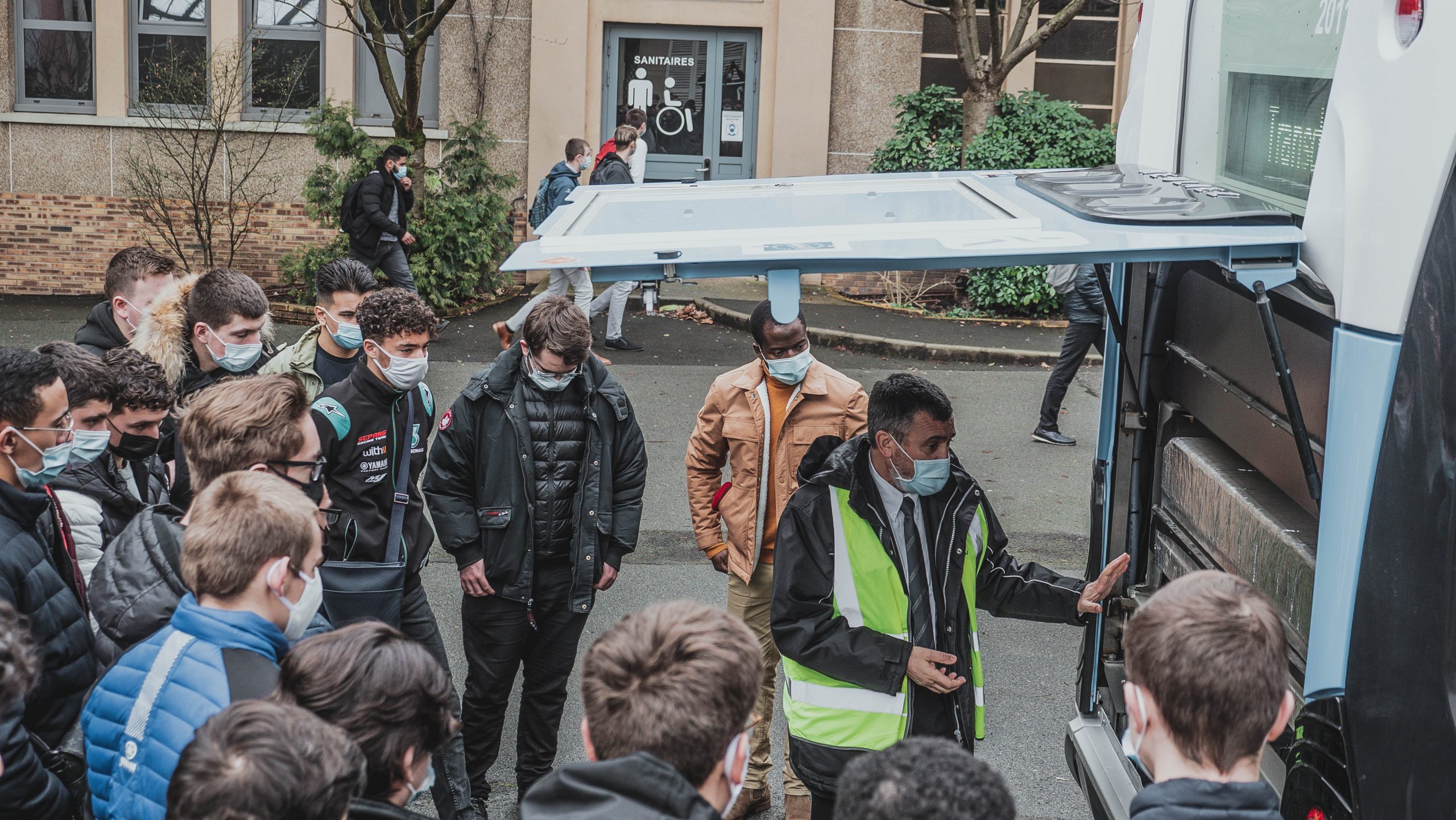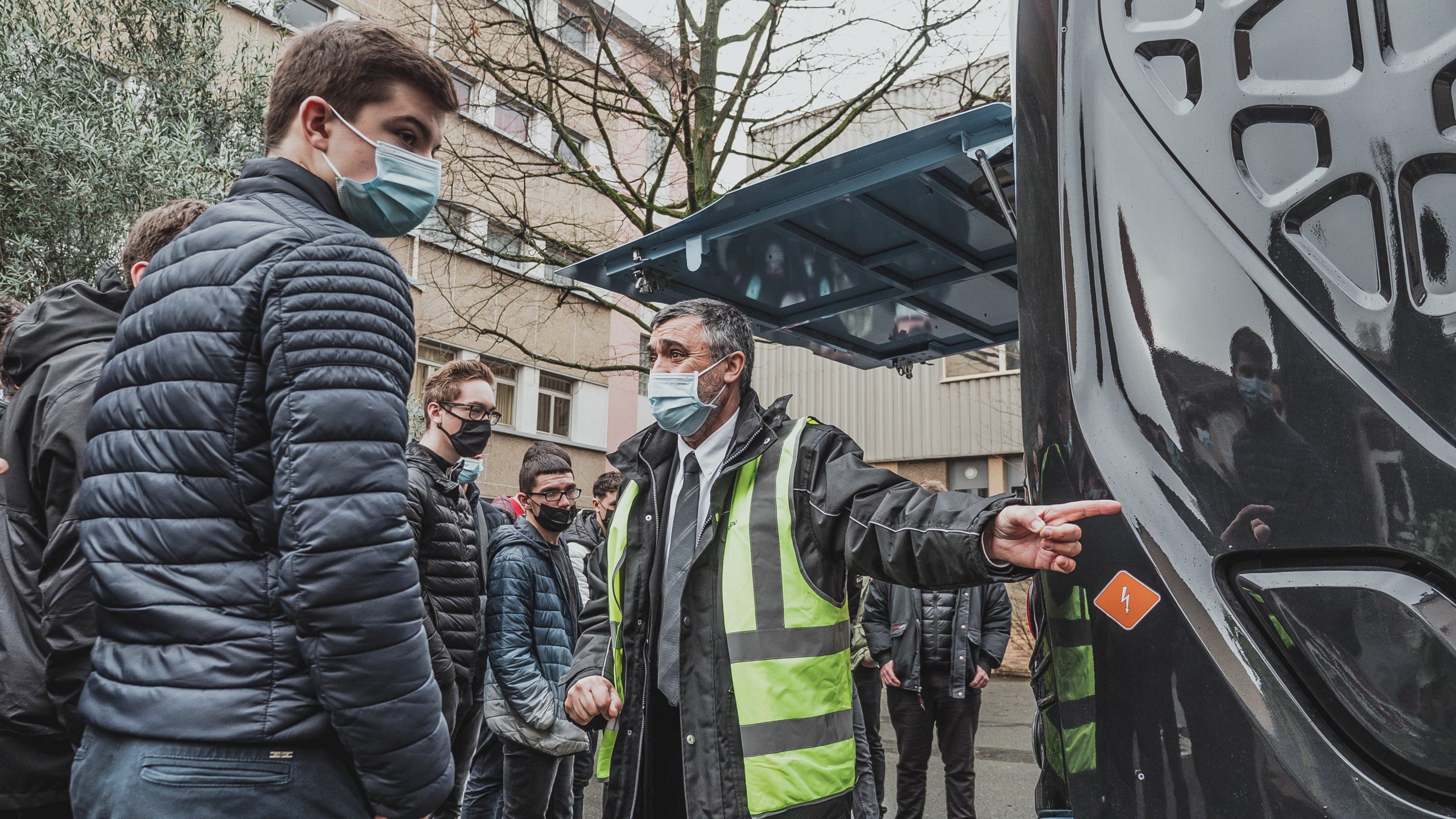 Avec TRANSDEV, les jeunes embarquent à bord d’un BUS électrique en compagnie d’un technicien lors de la Semaine des Services de l’Automobile et de la Mobilité. Il leur a expliqué le fonctionnement du bus et ses spécificités.