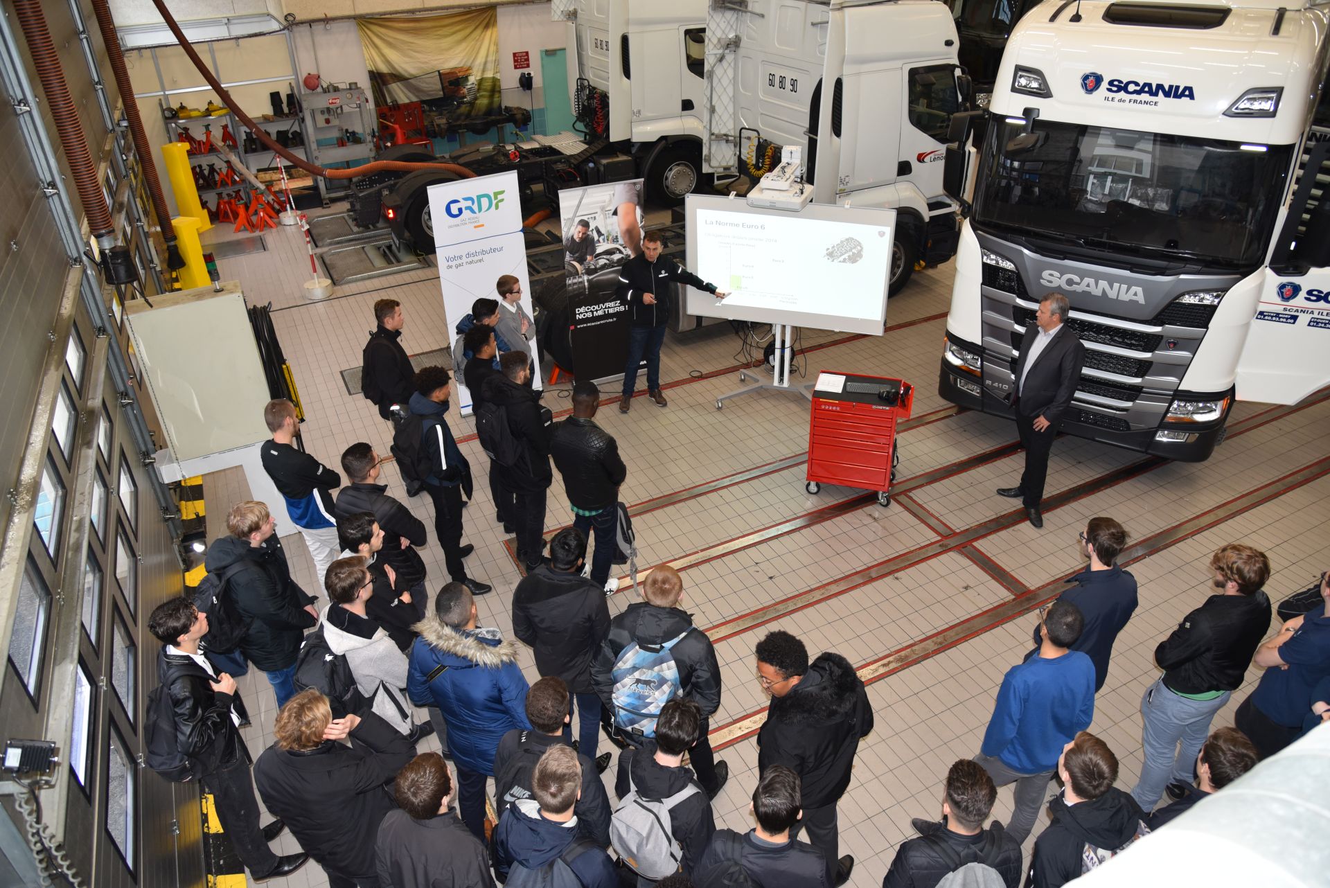Cette démarche s’inscrit dans le cadre de la « Safety week » organisée par le GARAC. En partenariat avec GRDF, une première journée de présentation a été consacrée au gaz. Une conférence de 45 minutes a permis à GRDF de présenter l’utilisation du gaz dans les véhicules, tout en abordant la possibilité du bioGNV. Les élèves ont ensuite pu écouter les conseils et directives du constructeur. Avant de passer à la pratique avec le Scania R 410 GNC.